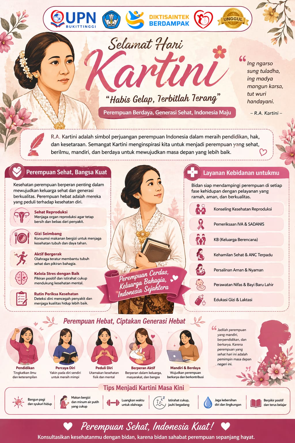 “Semangat Kartini hidup dalam setiap langkah perempuan yang merawat, menjaga ,dan memperjuangkan kesehatan— bukan hanya untuk dirinya, tetapi juga untuk keluarga dan bangsa. Di tangan perempuan yang berilmu dan peduli, kesehatan menjadi cahaya harapan yang tak pernah padam. ” “Perempuan sehat adalah pilar bangsa. Dengan tubuh yang kuat dan jiwa yang tangguh, perempuan mampu melahirkan masa depan yang lebih baik— itulah wujud nyata semangat Kartini di era modern. ” “Kartini mengajarkan kita untuk bangkit. Dalam dunia kesehatan, setiap perempuan adalah pejuang—yang tak lelah menjaga, menyembuhkan, dan memberi harapan. ” “Dari ruang perawatan hingga rumah tangga, semangat Kartini terus hidup dalam ketulusan perempuan yang menjaga kesehatan sesama. Karena sehat adalah hak, dan perempuan adalah penjaganya. ”